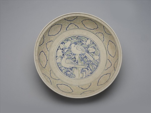 侈口外撇,弧形壁,圈足。盤心以釉下青花與釉上紅、綠、金彩繪林間果樹上對視雙鳥,有學者認為花鳥圖案似受中國明早期青花影響,內外壁皆飾青花菱花式開光,綠彩繪製波浪底紋,部分脫落。金彩雖餘少量留存,但效果佳,紅彩幾乎不存,但筆繪遺痕清晰。器底露胎,刷鐵汁一層。本批瓷器應是來自越南海陽省(Hai Duong,紅河流域下游)的Chu Dau窯址,風格上與 1990年代打撈的會安沉船(Hoi An Shipwreck,約為十五世紀末至十六世紀)出土器物相似。