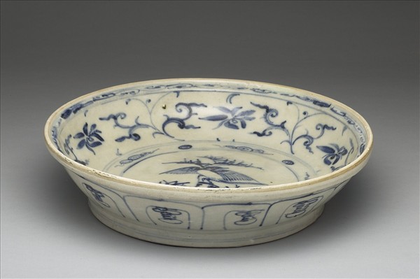 侈口外撇,弧形壁,圈足。盤心青花繪兩組鳥紋上下交疊,有地區特色,內壁飾花卉,外壁蓮瓣紋。器底露胎,胎骨甚厚,刷鐵汁一層。本批瓷器應是來自越南海陽省(Hai Duong,紅河流域下游)的Chu Dau窯址,風格上與 1990年代打撈的會安沉船(Hoi An Shipwreck,約為十五世紀末至十六世紀)出土器物相似。