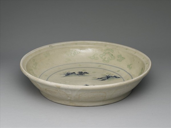 侈口外撇,弧形壁,圈足。盤心繪青花加釉上紅綠彩山水圖,內壁彩繪雲紋,外壁蓮瓣紋,彩料多脫落而使紋飾不清楚,但青花色澤佳。器底露胎,刷鐵汁一層。本批瓷器應是來自越南海陽省(Hai Duong,紅河流域下游)的Chu Dau窯址,風格上與 1990年代打撈的會安沉船(Hoi An Shipwreck,約為十五世紀末至十六世紀)出土器物相似。