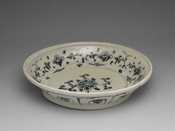 侈口外撇,弧形壁,圈足,有修坯痕,圈足不甚平整。盤心與內壁繪青花纏枝花卉,間飾有雲紋一周,外壁作蓮瓣紋,青花料渲染淋漓。器底露胎,刷鐵汁一層。本批瓷器應是來自越南海陽省(Hai Duong,紅河流域下游)的Chu Dau窯址,風格上與 1990年代打撈的會安沉船(Hoi An Shipwreck,約為十五世紀末至十六世紀)出土器物相似。