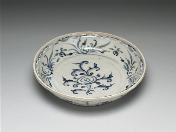 侈口外撇,弧形壁,圈足,口緣有舊傷。盤心青花繪圖案式靈芝花卉,周壁飾流暢的蘭草紋,外壁作蓮瓣紋,筆繪流暢,有深淺暈染。器底露胎,刷鐵汁一層。本批瓷器應是來自越南海陽省(Hai Duong,紅河流域下游)的Chu Dau窯址,風格上與 1990年代打撈的會安沉船(Hoi An Shipwreck,約為十五世紀末至十六世紀)出土器物相似。