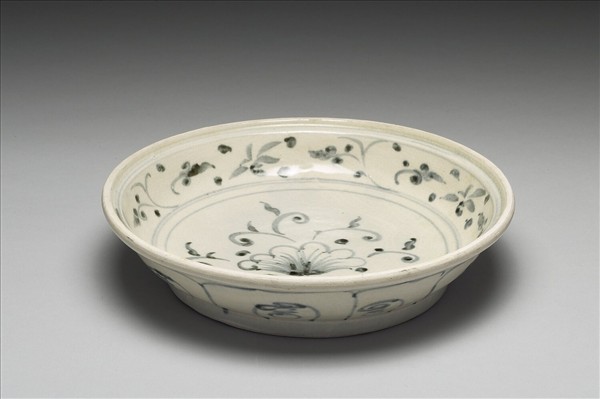 侈口外撇,弧形壁,圈足。盤心青花繪圖案式折枝花卉一束,內壁繪弦紋與卷草花葉紋,外壁變形蓮瓣紋,紋飾較鬆散,筆法簡略,釉面光亮。器底露胎,刷鐵汁一層。本批瓷器應是來自越南海陽省(Hai Duong,紅河流域下游)的Chu Dau窯址,風格上與 1990年代打撈的會安沉船(Hoi An Shipwreck,約為十五世紀末至十六世紀)出土器物相似。
