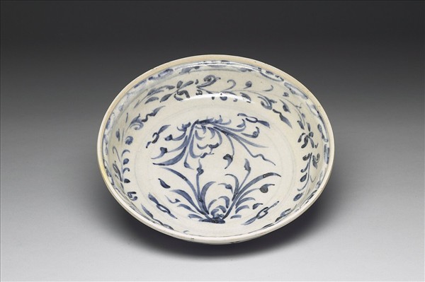 侈口外撇,弧形壁,圈足。盤心青花繪兩叢蘭草上下相對,內壁飾卷草花葉紋,外壁蓮瓣紋,筆繪快速流暢,青料色澤較明豔,釉面光亮。器底露胎,刷鐵汁一層。本批瓷器應是來自越南海陽省(Hai Duong,紅河流域下游)的Chu Dau窯址,風格上與 1990年代打撈的會安沉船(Hoi An Shipwreck,約為十五世紀末至十六世紀)出土器物相似。
