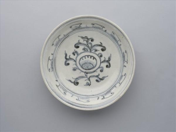 侈口外撇,弧形壁,圈足。盤心青花繪圖案式花卉,花心圖案特別,內壁飾圖案式波浪紋,筆觸簡單圖案特殊,外壁蓮瓣紋。器底露胎,刷鐵汁一層。本批瓷器應是來自越南海陽省(Hai Duong,紅河流域下游)的Chu Dau窯址,風格上與 1990年代打撈的會安沉船(Hoi An Shipwreck,約為十五世紀末至十六世紀)出土器物相似。