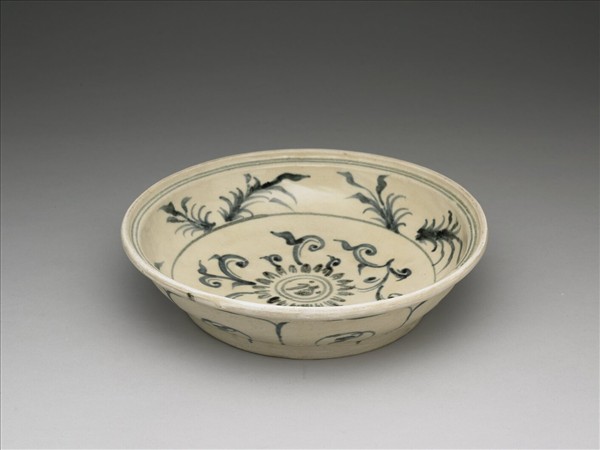 侈口外撇,弧形壁,圈足。盤心青花繪圖案式折枝花卉,花心圖案書有「福」字,內壁飾草穗紋四組,外壁蓮瓣紋。器底露胎,刷鐵汁一層。本批瓷器應是來自越南海陽省(Hai Duong,紅河流域下游)的Chu Dau窯址,風格上與 1990年代打撈的會安沉船(Hoi An Shipwreck,約為十五世紀末至十六世紀)出土器物相似。