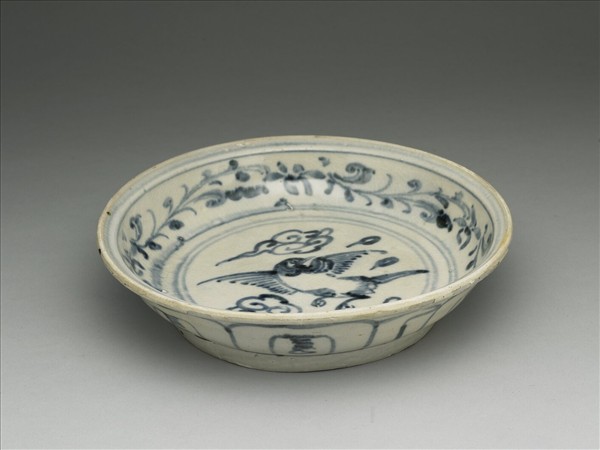 侈口外撇,弧形壁,圈足。全器以青花裝飾,盤心繪雲紋、飛鳥,周壁飾卷草紋。外壁繪飾變形蓮瓣紋一周。器底露胎,刷鐵汁一層。本批瓷器應是來自越南海陽省(Hai Duong,紅河流域下游)的Chu Dau窯址,風格上與 1990年代打撈的會安沉船(Hoi An Shipwreck,約為十五世紀末至十六世紀)出土器物相似。