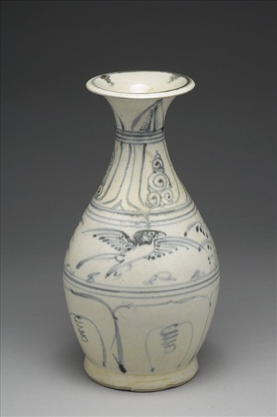 玉壺春瓶,侈口外撇,圈足。全器以青花裝飾,由上到下共有四層裝飾帶,上層為三角蕉葉、第二層為覆蓮瓣飾渦紋、第三層飾振翅飛鳥紋、下層飾仰蓮瓣紋。青料色較灰淡,鳥紋筆觸工謹。圈足內露胎,刷鐵汁一層。本批瓷器應是來自越南海陽省(Hai Duong,紅河流域下游)的Chu Dau窯址,風格上與 1990年代打撈的會安沉船(Hoi An Shipwreck,約為十五世紀末至十六世紀)出土器物相似。