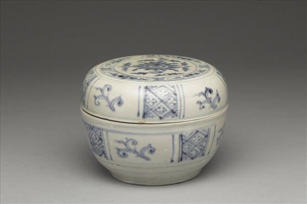 夾層蓋盒,平頂穹起的蓋內,另有一折沿淺盤置於器口部。全器以青花為飾,內繪小叢草葉圖。蓋頂繪正面圖案式花卉,蓋器周壁繪錦地與折枝圖案間次並呈。釉面光澤較弱。底露胎無釉。本批瓷器應是來自越南海陽省(Hai Duong,紅河流域下游)的Chu Dau窯址,風格上與 1990年代打撈的會安沉船(Hoi An Shipwreck,約為十五世紀末至十六世紀)出土器物相似。