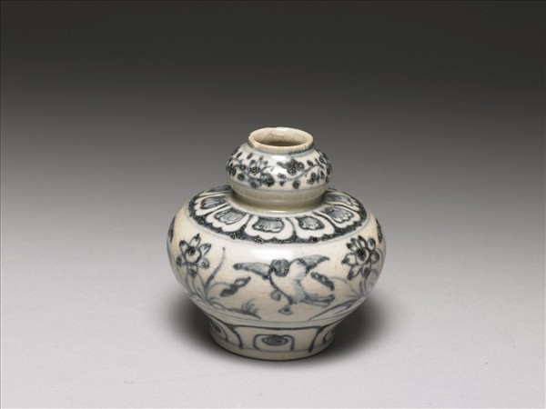 葫蘆式瓶,全器以青花為飾,上腹為轉枝花卉,下腹以藍地百花變形蓮瓣、飛鳥折枝蓮、變形蓮瓣為飾,線條短促迅捷,青料鐵份滲出。器底露胎。本批瓷器應是來自越南海陽省(Hai Duong,紅河流域下游)的Chu Dau窯址,風格上與 1990年代打撈的會安沉船(Hoi An Shipwreck,約為十五世紀末至十六世紀)出土器物相似。