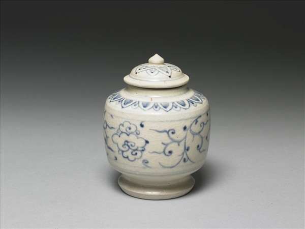 蓋罐,直口平肩、直腹圈足。全器以青花為飾,肩飾蓮瓣,腹部以細線白描繪卷草花卉與雲紋。蓋飾覆蓮瓣、寶珠鈕。器底露胎。本批瓷器應是來自越南海陽省(Hai Duong,紅河流域下游)的Chu Dau窯址,風格上與 1990年代打撈的會安沉船(Hoi An Shipwreck,約為十五世紀末至十六世紀)出土器物相似。