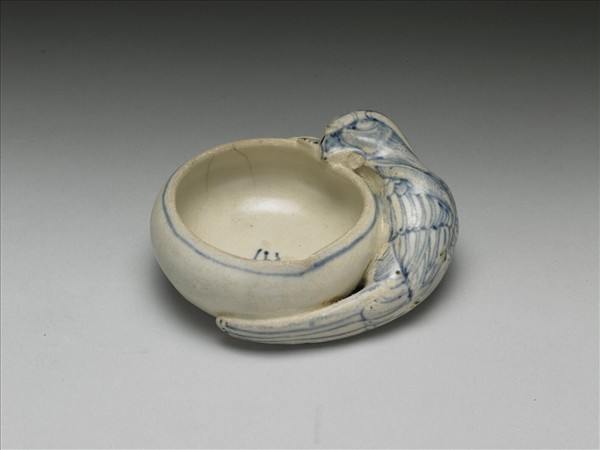 鸚鵡銜桃杯,作一鸚鵡形口銜桃實,實挖空為容器,桃枝部分傷斷。全器以青花為飾,鳥身羽翅描繪細緻,桃上飾有葉與弦紋。杯裡書一「榮」字。器底露胎,刷鐵汁一層。本批瓷器應是來自越南海陽省(Hai Duong,紅河流域下游)的Chu Dau窯址,風格上與 1990年代打撈的會安沉船(Hoi An Shipwreck,約為十五世紀末至十六世紀)出土器物相似。