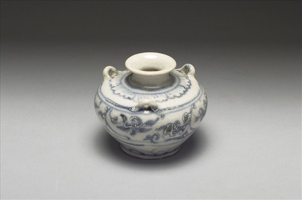 撇口,收腰頸,圓肩,削腹,肩上立三繫耳,圈足,釉面受蝕有剝落。肩、腹與下腹部以弦紋間隔,分繪飾蓮瓣紋、轉枝花紋與仰蓮瓣紋,釉面光亮。器底露胎。本批瓷器應是來自越南海陽省(Hai Duong,紅河流域下游)的Chu Dau窯址,風格上與 1990年代打撈的會安沉船(Hoi An Shipwreck,約為十五世紀末至十六世紀)出土器物相似。