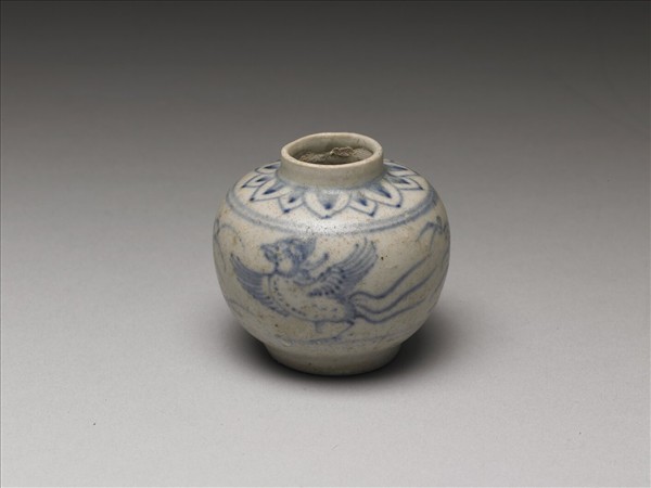 小口,短頸,豐肩,碩腹,圈足。全器以青花為飾,器身繪鳳紋一對,肩部蓮瓣紋。器底露胎。本批瓷器應是來自越南海陽省(Hai Duong,紅河流域下游)的Chu Dau窯址,風格上與 1990年代打撈的會安沉船(Hoi An Shipwreck,約為十五世紀末至十六世紀)出土器物相似。