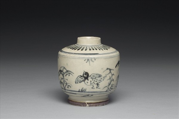小口,短頸,平肩,直腹,圈足,足沿有傷缺。全器以青花為飾,腹部繪禽鳥與樹石,肩部菊瓣紋一周。器底露胎。本批瓷器應是來自越南海陽省(Hai Duong,紅河流域下游)的Chu Dau窯址,風格上與 1990年代打撈的會安沉船(Hoi An Shipwreck,約為十五世紀末至十六世紀)出土器物相似。