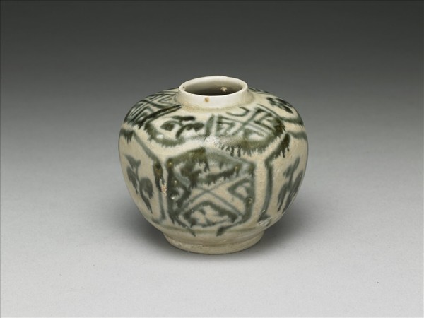 六方小罐,以各不同多角方塊組成,短頸,平肩,碩腹,圈足。全器以青花為飾,腹部每面繪不同錦紋,青料渙散。器底露胎。本批瓷器應是來自越南海陽省(Hai Duong,紅河流域下游)的Chu Dau窯址,風格上與 1990年代打撈的會安沉船(Hoi An Shipwreck,約為十五世紀末至十六世紀)出土器物相似。