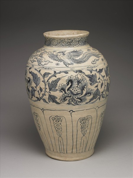 圓口小唇,短頸,豐肩,碩腹下歛,平底,圈足。全器以青花為飾,器腹以弦紋分隔三個主要裝飾帶,由上而下分繪雲間鳳紋、牡丹與變形蓮瓣紋,頸部皮球錦地紋,筆觸細膩柔美。器底露胎,刷鐵汁一層。本批瓷器應是來自越南海陽省(Hai Duong,紅河流域下游)的Chu Dau窯址,風格上與 1990年代打撈的會安沉船(Hoi An Shipwreck,約為十五世紀末至十六世紀)出土器物相似。