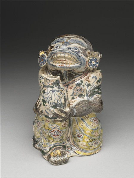 模塑成形的象生猴器,除器底外全體施釉,器身有釉下青花及釉上多彩爭豔,部分以漆層打底而後描飾金彩。猴態為擬人化,右腳屈膝,帶環的手持一玉壺春瓶置於膝上,左腳掌面朝後。臉部朝上仰望,五官造型誇張,作瞪目張嘴狀。此猴耳垂肥大,並繫著一對以青花勾勒花朵紋樣的大耳飾,從頸部到身軀處,交領右衽的衣著內呈現清晰鎖骨。腰間左側配有一把長劍,衣著背後畫有一騎馬人物打獵圖像。這件作品有著武生、英雄造型,似乎身份不凡,令人聯想起印度史詩《羅摩衍那》(Ramayana)主角之一的哈奴曼(Hanuman),哈奴曼既是猴軍的統帥,也是印度完美忠臣的典範,在印度廣為傳頌,後來也流傳到印尼等地。