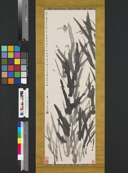 徐悲鴻(西元一八九五-一九五三年),江蘇宜興人。原名壽康,十九歲父逝,遂更名悲鴻。父遠章乃一民間畫師,徐氏幼承家學,年十餘即外出鬻畫,稍長更遊學海外,先後赴日、法、德等國,精研寫實主義繪畫。返國後,揭櫫國畫改良論,提倡中西合璧式的創新理念。影響近代中國藝壇及美術教育,至為深遠。本幅畫芒草叢生,群雀飛舞,用筆縱恣而布局雄奇,兼融金石派之強健氣息與嶺南派的破墨技法,略別於徐氏習見之寫實風格。