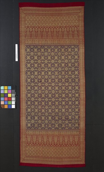 位於南蘇門答臘東部的巨港,是東南亞最古老的城市之一,同時也是重要的港口與貿易中心。巨港馬來人的傳統禮服,常以織金錦「宋吉」(songket)作為面料,織金織物往往被視為財富與權勢的象徵,金銀線材多半從中國進口,高品質的金線能確保織好的金錦舒適柔軟。肩布通常是一條長布,可從短邊對摺披在肩上作為披肩。這條多色絲質肩布上以金線織了密集連續的八瓣玫瑰與八芒星紋飾,是帶有伊斯蘭風情的常見主題,也是極具巨港特色的織物。