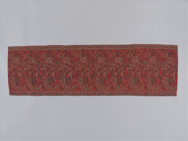 喀什米爾地區以生產羊毛織物聞名於世,特色是羊毛材質纖細柔軟,織造與刺繡工藝精緻,配以傳統的佩斯利紋與繁複的花卉設計,19世紀受到歐洲上流社會婦女喜愛,暢銷世界各地。本件原為毛織披肩的布邊,緯向斜紋的織造結構,各種花卉組合的盆花型式呈現帶狀佩斯利紋樣。