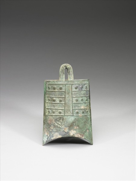 鈕鐘,橢圓體,半球形枚,橋形口。舞部、篆部皆飾蟠虺紋。
