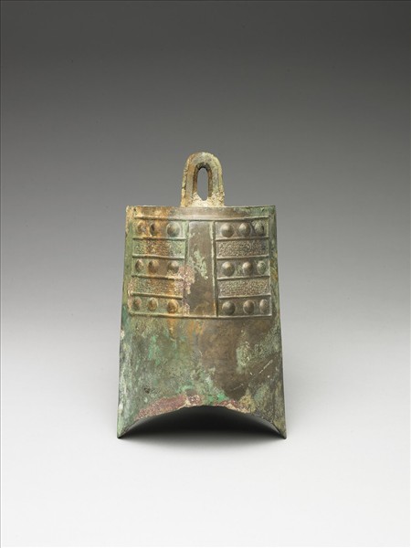 鈕鐘,橢圓體,半球形枚,橋形口。舞部、篆部皆飾蟠虺紋。