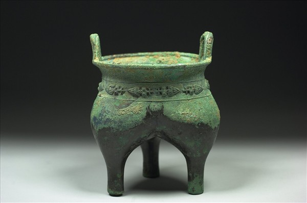 立耳,束頸、分檔,三足。頸部飾蟬紋。