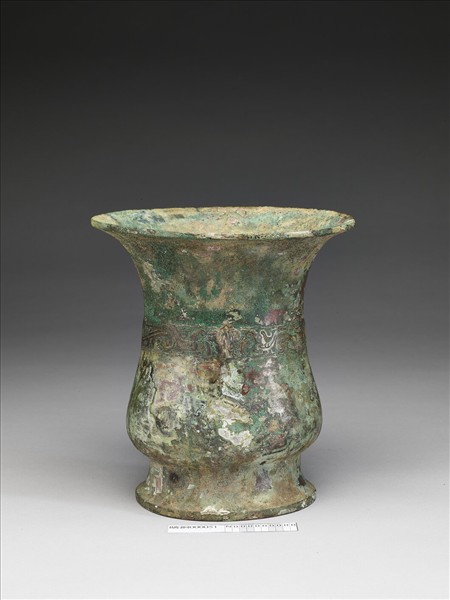 敞口,束頸,下腹廣闊,底為下敞式圈足,頸間飾二組相對卷尾鳳鳥紋,均以一獸首為中心作相視狀,以雲雷紋作底紋。前後合範,紋飾接合處有誤差,目視可見內壁及底多處墊片,分布均勻。