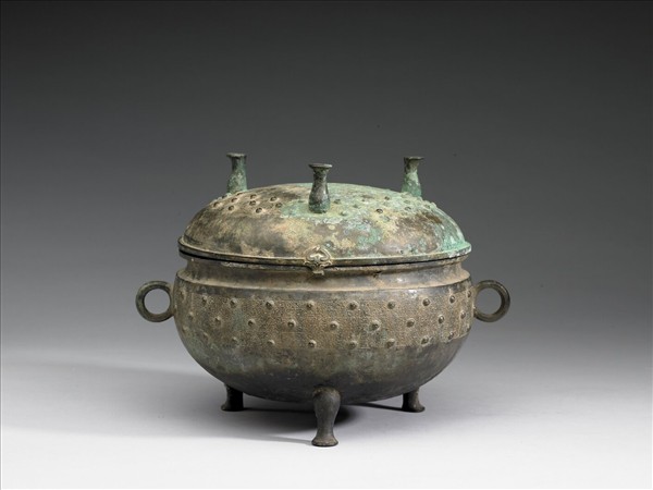 附蓋,束頸、環耳、圓腹、蹄足,蓋上有倒置三蹄足,以利開蓋時放置。蓋沿飾三小獸首,蓋面與腹部飾蟠虺紋,蟠目高凸呈乳丁狀。