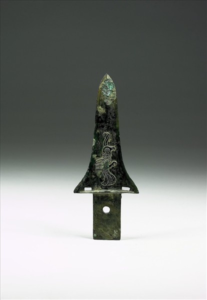 長援,援末近欄處向外擴張,長方形內。援與內相接處兩方穿,內上一圓穿。兩面鑄相同鳥紋。