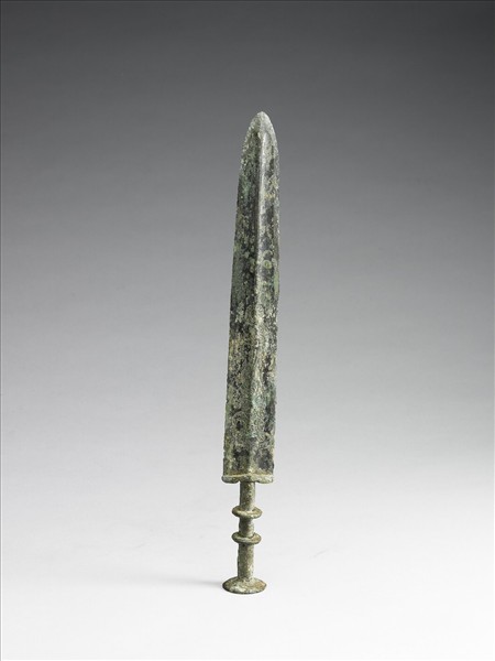 上部狹長下部略寬,中脊稍厚,為劍身;未端接有把手,為劍柄,呈圓柱形,莖部有兩凸箍。劍身上以陰刻線紋飾有虎紋。