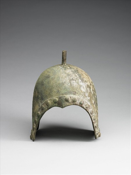銅盔作半球形,頂上飾方橋形鈕,左右兩側下垂成護耳,前開臉呈尖弧,後開臉呈圓弧。前、後開臉及護耳下沿飾乳丁紋,兩側護耳下沿各有兩個小鈕。