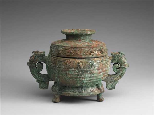 附蓋,子母口,鼓腹,環耳,圈足。耳作獸首形,帶珥,圈足下接三獸形足。蓋面與腹部下方有瓦紋,蓋沿與口沿處飾有目竊曲紋,紋飾帶中央飾小獸首。圈足則為垂鱗紋。