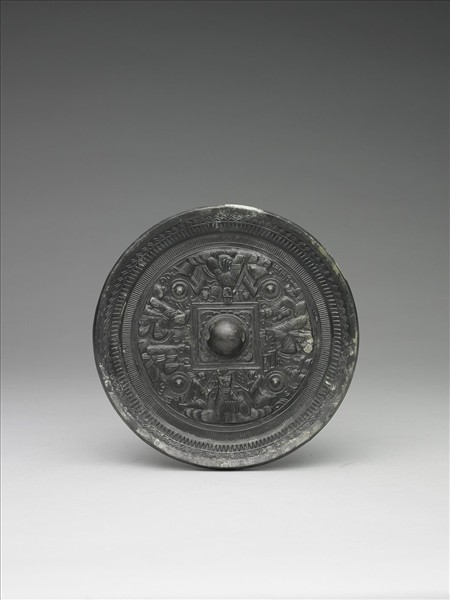 鏡背以四枚乳丁將紋飾分作四等分,兩位神仙隔著半球形的鏡鈕頂頭相對,神仙的左下方分別題著「西王母」與「東王公」,另外兩區人物旁則分別題著「吳王」、「越王」,越王與一名大臣作交談狀,或許是與范蠡在商談復國大計,吳王的腳邊放著兩隻帶提梁的大酒壼,身邊還跪著兩名女子,似乎正沈迷於酒色之中,簡單的構圖有力的勾勒出勾踐復國的歷史故事。正反兩面均呈深灰近黑而光亮不減,是一般人俗稱之黑漆古。