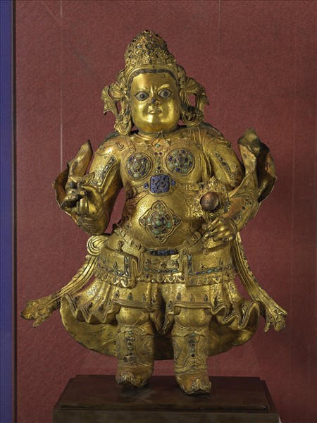 本器為西藏作品,造像的身形矮胖壯碩,腹圓突出,臉形圓渾,皺眉,瞪眼怒視。頭戴寶冠,耳掛一飾,身披甲冑,內著袍,腰下膝裙成褶,厚重外揚。小腿膊紥吊腿,腳穿靴,身形威武,令人望而生畏。左手持寶珠,右手握似劍柄物,應是長劍,當為南天王像。 天王衣裝繁複,裝飾華麗。髮長垂肩,頭上戴梁冠,額前再戴一嵌飾寶石的鳥首冠,頷下繫繩,冠帶垂肩,轉折向上飛舞。披膊呈獸首狀,衣袖大片外露上揚。身側飄帶亦層疊而外張,亦顯雄壯。甲冑佈滿米字形編織紋,衣緣飾淺浮雕帶狀如意紋,膝裙上陰刻雲紋、碎花圖案,甲帶及腰帶均有方形環扣,胸前嵌青金石龍紋方飾板,左右胸前及護腹甲分別飾嵌青金石、綠松石的花形圓甲板與菱形甲板,衣緣和綁腿多處鑲嵌綠松石、青金石等各色寶石。 造像以錘鍱、接合、嵌寶石的技法製成,重量輕,然視之卻雄壯威武,背面有二方形缺口,應為原裝臟口,上背部有修補,寶石嵌件多處缺,手上寶珠持物鬆動,持劍殘缺,面部等處小傷破,然仍保留明代西藏工藝原狀,十分難得。