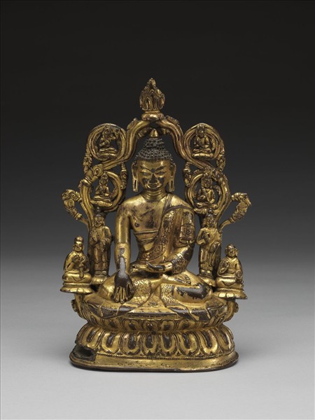 尊像曾遭撞擊,台座右側破損,後方內凹,臉部鼻、口和左眉眼均撞平。佛結跏趺坐於蓮座上,左手平放腹前,右手下垂手背向下觸地,作降魔印,是釋迦佛證道時的手印。佛臉方圓,肉髻高,僧衣貼身,衣緣刻花卉圓案,表現尼泊爾的特色。台座作蓮花台,由後方兩側伸出枝蔓捲曲成四圓形,內坐菩薩,猶如背屏,正上方兩莖相合成寶珠形,也是尼泊爾常見的風格樣式。背屏中四菩薩帶冠、耳環和臂釧,其中三者似持轉經輪。佛左右兩側立二脅侍弟子,當為舍利弗和目犍,最外側兩喇嘛坐於蓮座上,右僧侶連戴船形帽,左僧侶剃髮,台座後側刻藏文名。是一件具尼泊爾風格的西藏的作品。