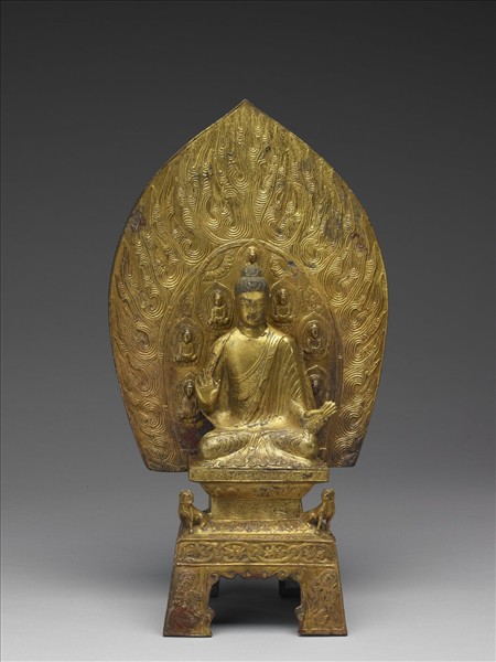 尊像由背光、坐像與台座構成。背光為蓮瓣形,底部收平,上部收尖,屏障主尊的全身,更向上延展,將造像的威嚴向外擴張。主尊結跏趺坐,身著袒右肩僧祇支,外披大衣,右手作無畏印,左手握住衣角,藉由大衣環繞身體,將坐像向內收斂包覆,形成全像堅實而穩定的核心。台座分上下兩層,下層為方形,上層為亞字形須彌座,底部寬廣穩定,上部漸收窄,營造出高聳的氣勢。座前兩立雕獅子,回首轉身,姿態威武。 背光以成束的珠串綵帶區隔出內、外圈。內圈為七尊小坐佛,其中三尊組成主尊的頭光,外圈環列U形火焰紋,每一個火焰紋內又填滿平行排列的弧形線,有如熊熊燃燒的烈火。主尊坐佛的捲髮作大渦紋,五官清秀,大衣衣緣呈S形翻邊,衣褶呈Y字形分叉,與背光的火焰紋相呼應。台座最上緣圍繞曲折的卷草紋,須彌座的斜面為仰覆蓮瓣紋,中央束腰飾菱格狀花瓣,下層方形台座的上緣由穿環上下交錯的棕櫚葉組成一帶狀飾,座足四面開光,兩側為供養人,三面共六位。 背光背面飾說法圖像,上層為法華經,塔內為釋迦和多寶佛並坐,塔外兩側為維摩詰經文殊問疾品的場面;中層中央為釋迦在鹿野苑初轉法輪;下層中央為誕生佛,左側摩耶夫人攀樹而立,太子自右脅誕生,右側龍王浴佛,最外側兩長方形榜題,現字跡已不清。台座背面刻有銘文:「太和元年九月十日安熹縣堤陽□□願己身為□□母造釋加聞佛,又為居家眷屬大小現世安隱,亡者生天宣語諸佛,所願如是,故記之耳。」 尊像和台座分鑄接合而成,背光另鑄,以插梢固定在坐佛背面。造像為青銅鎏金,青銅胎質緻密,鍍金厚,與胎連接緊密,金色黃帶赤,作工十分細緻精良。表面局部有舊傷缺,局部有鏽,經修復,狀況已穩定。