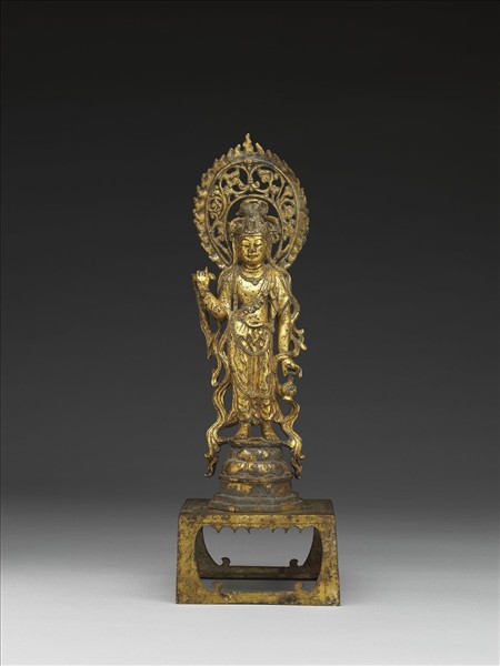 頭光及方形台座另鑄,鍍金有點狀剝落,胎與金結合不似盛唐造像緊密,胎質亦較鬆。菩薩頭頂有坐佛,右手持楊柳,左手拎一淨瓶,應為觀音菩薩。菩薩臉圓帶方,眼下視,鼻翼寬,嘴形闊,五官和臉偏扁,表情平靜。上身肩寬,腰部微微右提,左膝微彎,動感含蓄。髮散肩頭,頭側飄帶沿肩曲折緩緩飄下至腕側而止,天衣繞臂轉折下垂,如波浪狀,姿態閑適鬆弛。裙頭外翻,衣裙散落,胸前斜披的天衣,曲折疊繞,富於平面的裝飾效果。頭光成橢圓形,內四瓣花形,外圈各一蔓草由兩側蜿延至中央相結,最外緣火焰紋成鋸齒形,和上海博物館藏,傳河南新安縣狂口西村出土的中唐金銅藥師立佛,以及日本泉屋博古館藏,天寶三年(744)的金銅立佛趣味相同,具圖案化和裝飾性趣味。全像裝飾富麗,姿態含蓄,如少婦之美。