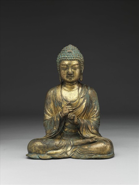 鍍金褪,無台座,背面無頭光、身光插榫。兩手置胸前,右手握住左手食指,作智拳印,代表佛具有一切智慧,是大日如來特有的手印。臉圓扁,鼻寬,髮似帽形戴在頭上,肩微下垂,著通肩式袈裟,手肘處衣褶在光影下如毛筆線條,下筆輕再重按,袖口由兩線表示,兩足邊的衣裙,集中數線,線條流暢,以平面繪畫概念表現雕塑的立體感,表現宋代造像的特質。
