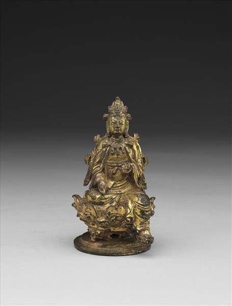 鍍金色殘褪,缺背光,蓮花座下中空,可能另接一座。頂有化佛,左手似持淨瓶,瓶頸斷,右手置膝上,第二、三指前伸,作與願印,應為觀音菩薩。髮梳高髻,坐於複瓣仰蓮台座上,瓣間露出蓮蕊的直紋理,下承几形圓座,上身短,坐姿略挺直,冠帶沿肩而下,問飾結,和山西大同華嚴寺薄迦教藏殿遼重熙七年(1038)菩薩坐像,當有前後一脈相承的關係。