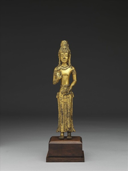 鍍金微褪,台座後加,足下兩插榫,原應加座。菩薩直立,身形直,臉形稍扁,鼻寬唇厚,面容具特色。裸上身,下著貼身裙,造型和站姿都非常特別。髮梳高髻,前有小坐彿,髮冠編排密整,裸上身,頸飾瓔珞,耳飾螺形耳環,臂戴釧,腕配珠環,腰繫帶,帶上花形間飾,下著裙,貼身,在直立的雙足前整齊弧形裙排列,右手上舉,左手略彎垂,兩手之第一、二指均相揑,跣足。克利佛蘭博物館(Clevelaand Museum)、芝加哥大學美術館(Chicago College Gallery)、佛瑞爾美術館(Freer Gallery)等博物館均藏相同造型觀音像,聖地牙哥博物館(San Diego Museum)所藏者甚至題銘,說明該像鑄像者是大理國國王段政興(1147-1172在位),本院所藏大理國張勝溫梵像卷(成於1173-1176)稱此類型觀音為「真身觀世音菩薩」,同時大理祟聖寺主塔1981年的出土報告也發表造型相同的金菩薩,背光完整,臉更寬扁。因此真身觀音是雲南南詔大理國特殊的地方信仰,圖像特徵固定且沿續一段相當長的時間,而其風格則和東南亞相關連。