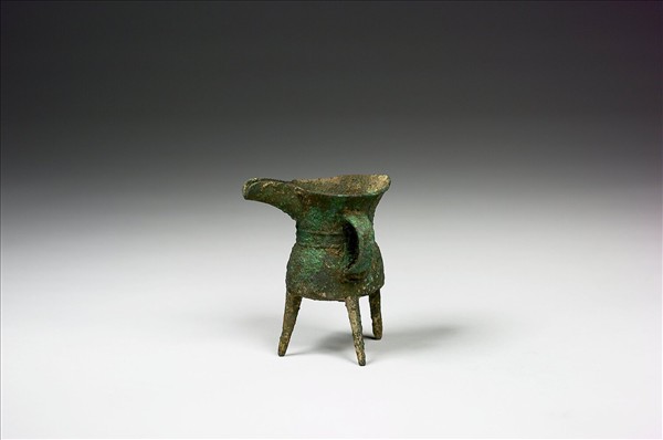 口外撇、束腰、平底、錐形足、獸首鋬、流口向內捲曲。腹部中央有二凸弦紋。