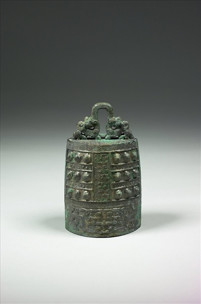 購銅155-160六件成套。橢圓體,鏤空回首龍形鈕,盤蛇狀螺旋形枚,平口。舞部、篆部、鉦部飾蟠螭紋,外繞一周竊曲紋,鼓部則有兩交龍紋組合而成的獸面紋。