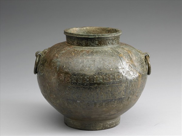 盤口、短頸、斜肩、歛腹、圈足,肩部兩側有獸面銜環。頸部為一圈獸紋,外壁以三角形幾何紋帶與四瓣花紋間隔出方形空間,其中飾有各色人物,或持刀劍、或搗磨。