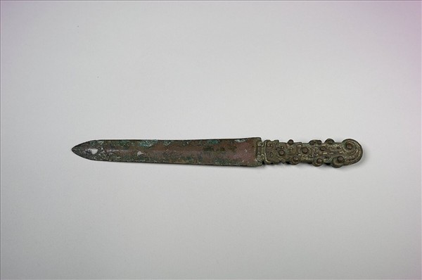 柄及器身均呈扁圓形,尖端略傷,柄身飾以似人似獸之鏤空紋飾,與河北省懷來縣出土之春秋晚期嵌松石柄青銅短劍相近,本件當屬春秋晚期至戰國早期器。