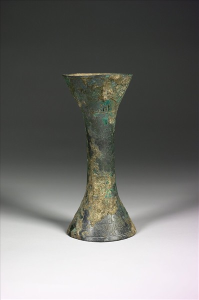 器中空無底,兩端外撇,中有握把。上下兩端以陰刻細紋飾有三角形紋與鳥獸紋。