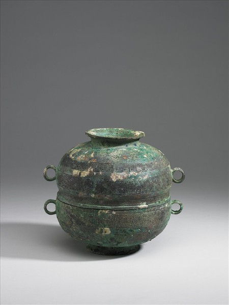 附鈕蓋,子母口,圓腹,圈足,蓋及腹部兩側皆有一對環耳。蓋及腹部飾蟠螭紋,蓋沿為有目竊曲紋。