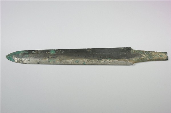 劍身狹長扁平,中脊凸起扁平,其上刻銘文兩行,無格,莖扁平,於穿孔處斷殘。器形具戰國時代風格,刻銘文字與三晉時代之兵器文字相近。
