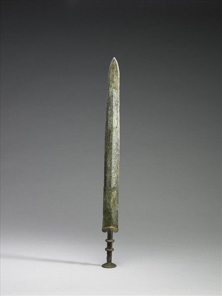 圓形劍首,圓柱形莖上有二道凸箍,劍格寬而厚,劍身自上而下飾連續S形之鉤連紋,甚為特殊少見,接近巴蜀或西南地區之風格。