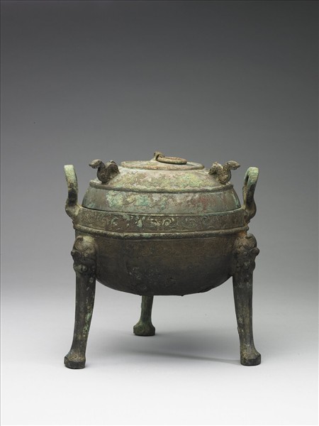 附鈕蓋、環形鈕、子母口、立耳、圓腹、蹄足,蓋上另有三立雕小獸,足上部做獸面。蓋有兩道凸棱,腹部飾簡化變形獸紋與蟠夔紋。